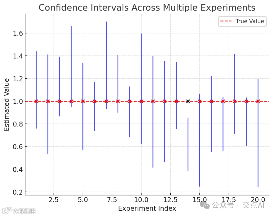 注意:95%的置信区间包含真实值(红点),但也有5%的置信区间未包含真实值(黑点),体现了置信水平的定义。