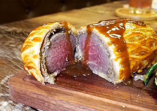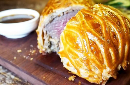 威灵顿和牛是选用了澳洲M5和牛,并以5小时慢煮牛肉,因为是慢煮牛肉所以更能销着肉汁,令肉质更鲜嫩,再加上鹅肝野菌酱及巴马火腿裹在酥皮内,令整体味道浓郁,层次丰富。威灵顿和牛可供2-3人享用。