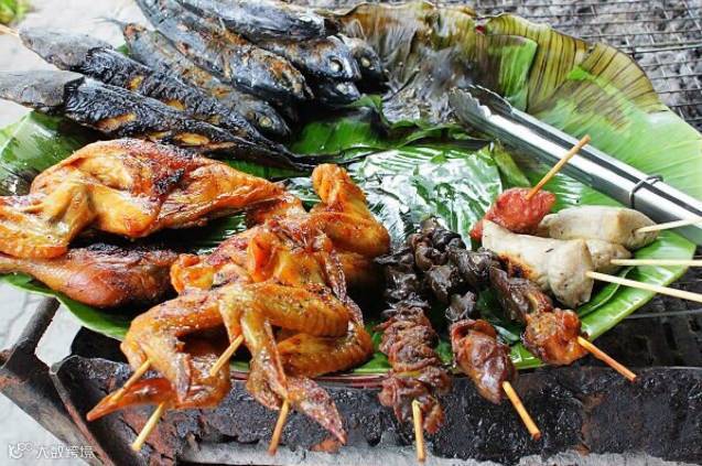 肉类烧烤:泰国乃至整个东南亚对于肉类和水产的习惯食用方式除了炖煮便是烧烤。满大街都是烧烤摊,炉子上都摆着等待被烤熟的各种肉类和涂满盐粒的鱼。烤熟了再配以爽口的生黄瓜和生菜,蘸着味道浓郁的酱料,吃在嘴里别有一番风味。