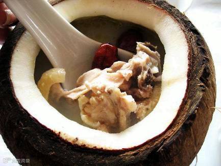 椰汁鸡汤:泰式椰汁鸡汤可谓是曼谷名汤,已有数百年的历史。因为椰奶带甜味,又比较油腻,所以一般在泰国菜中,椰奶多用作咖喱菜肴之调味或调色,极少作烹汤用。