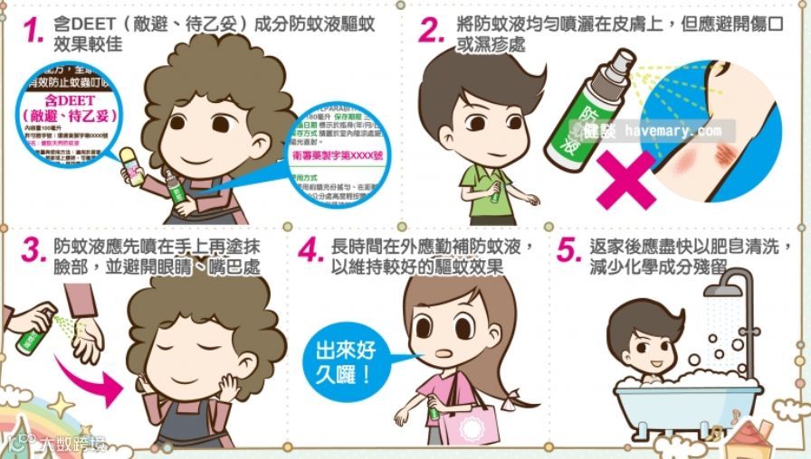 医师表示,以目前市售的防蚊产品来说,以含有DEET成份者驱蚊较果较佳;然而,在使用上也要留意勿让防蚊液直接接触眼睛、嘴巴,若长时间在户外应勤于补喷,回家后应尽快以肥皂冲洗干净喔!