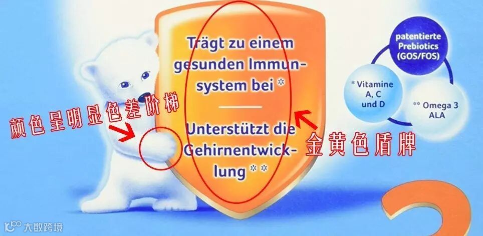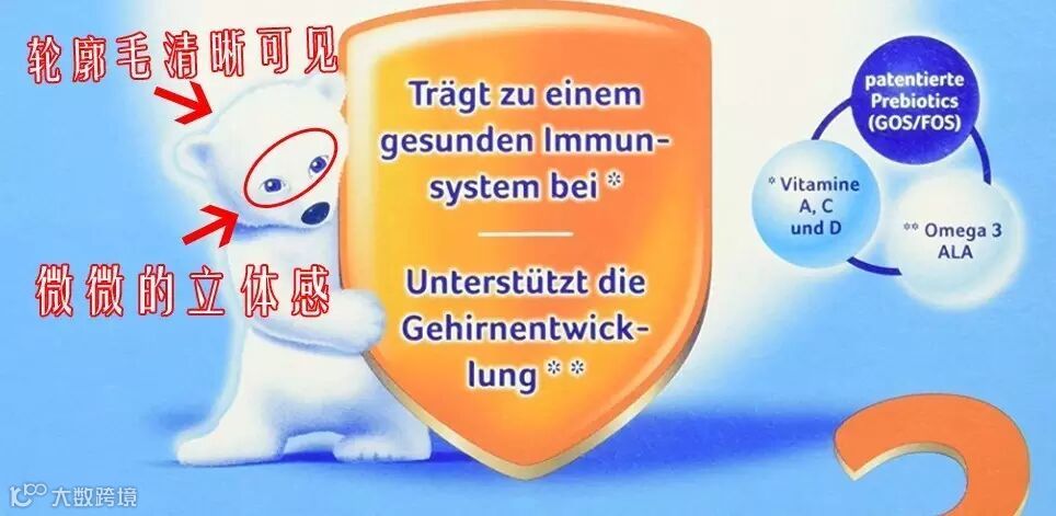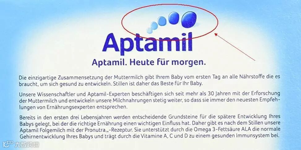爱他美奶粉的背面是德文,文字比较纤细,而且整体比较精致,同样有五个小指头印,也是明显的色差阶梯状。