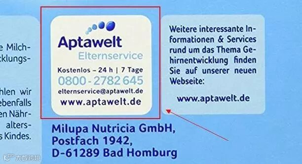 背面还有爱他美热线电话,同时有德国爱他美官网的网址;