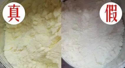 真奶粉细腻发粘,易粘住牙齿、舌头和上腭部,溶解较慢,且没有糖的甜味;假奶粉放入口中很快溶解,不粘牙,甜味浓;