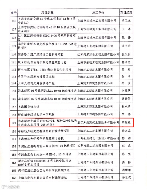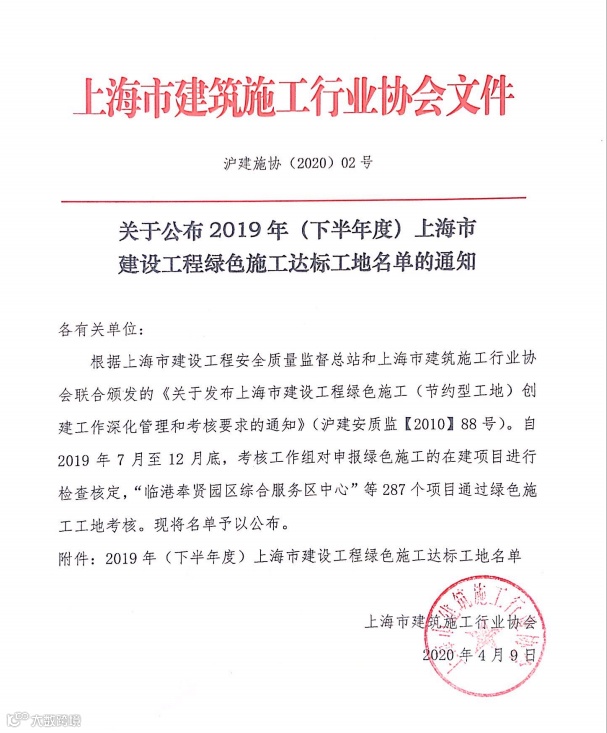 近日,从上海市建筑施工行业协会传来喜讯,由公司承建的临港新城主城区WSW-C2-05地块普通商品房项目荣获2019年度“上海市建设工程绿色施工达标工地”称号。