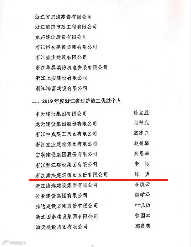 此外,通报还授予集团公司常务副总经理陈勇为2019年度浙江省进沪施工优胜个人,项目经理章圣炎、李冠军、任小良、朱伟泉、任素龙、章迁、陈永军、吴其标由于在进沪施工中作出的优异成绩共同被授予“2019年度浙江省进沪施工优秀项目经理”称号。