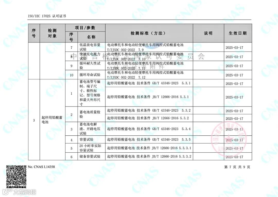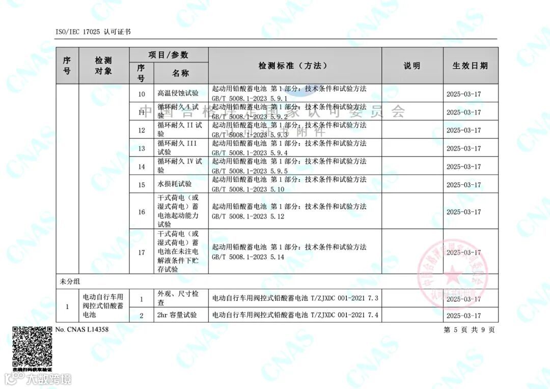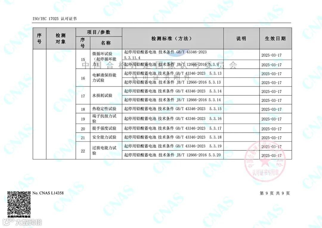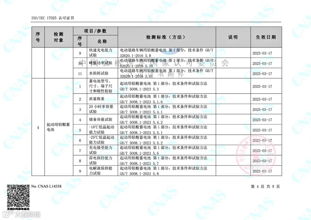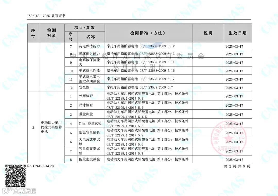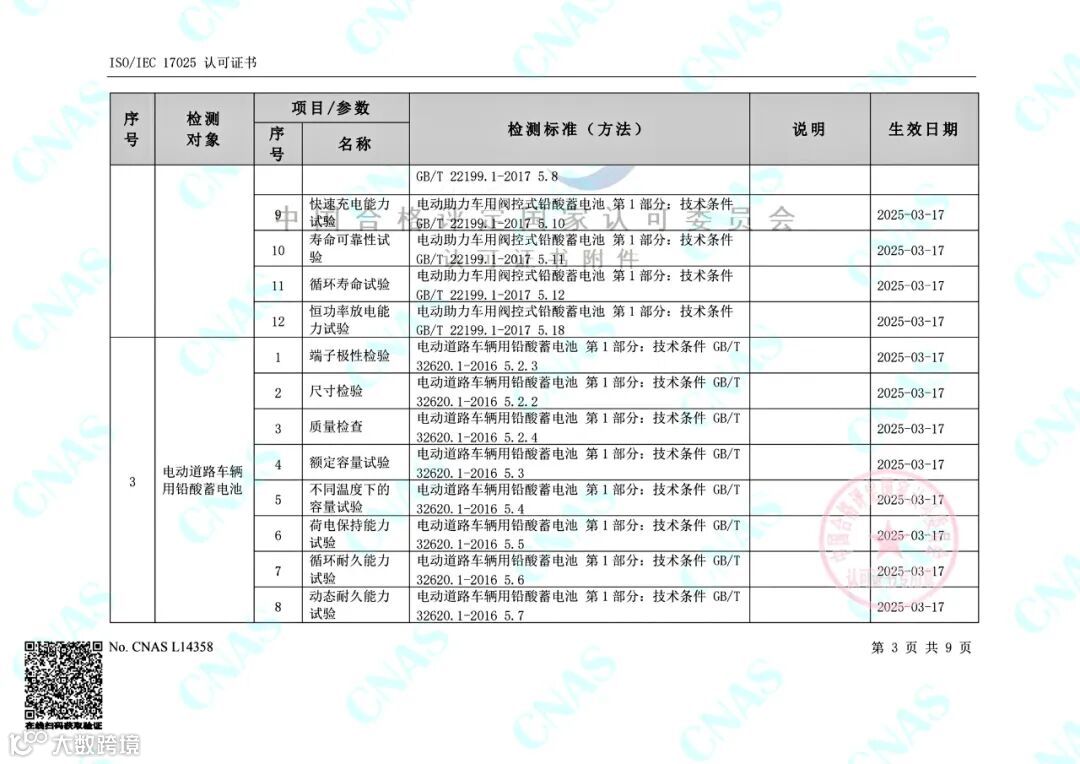 目前,金科力电池检测公司的可检测项目包括电动助力车用阀控式铅酸蓄电池(GB/T 22199.2-2017)、电动道路车辆用铅酸蓄电池(GB/T 32620.1-2016)、摩托车用铅酸蓄电池 (GB/T 23638-2009)、起动用铅酸蓄电池GB/T 5008.1-2013)、起停用铅酸蓄电池(JB/T 12666-2016)、起停用铅酸蓄电池(GB/T 43346-2023)、电动自行车用阀控式铅酸蓄电池浙(T/ZJXDC 001-2021)、电动摩托车和电动轻便摩托车用阀控式铅酸蓄电池(T/ZJXDC 002-2022)共8份标准105项参数;涵盖动力电池,摩托车起动电池,汽车起动、起停电池等多个领域的电池容量、低温容量、低温起动能力、充电接受能力、寿命循环等各项电气性能测试指标。