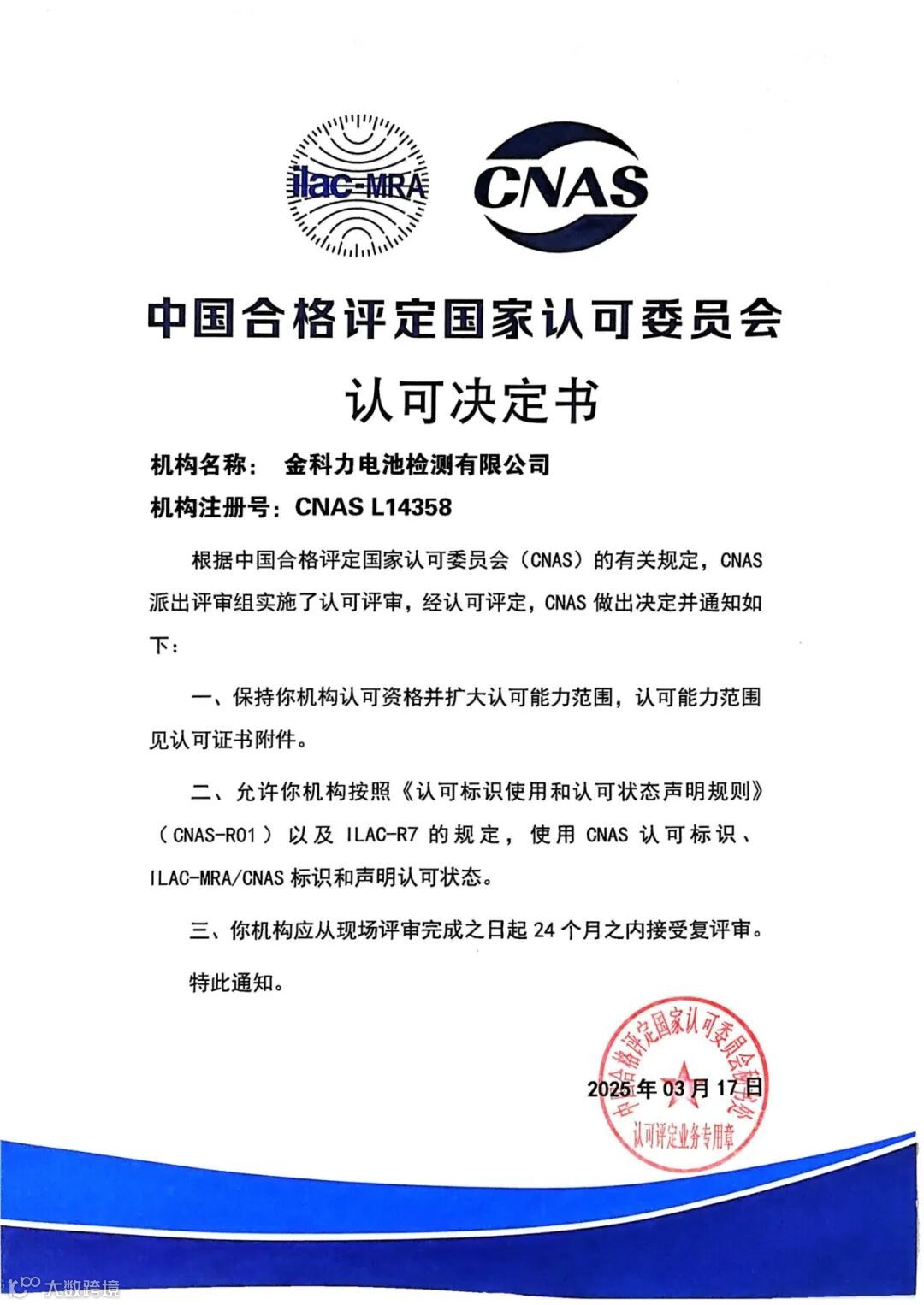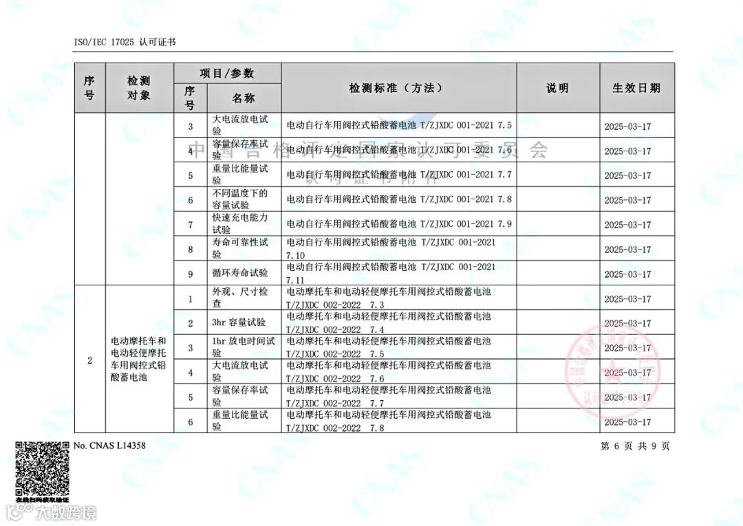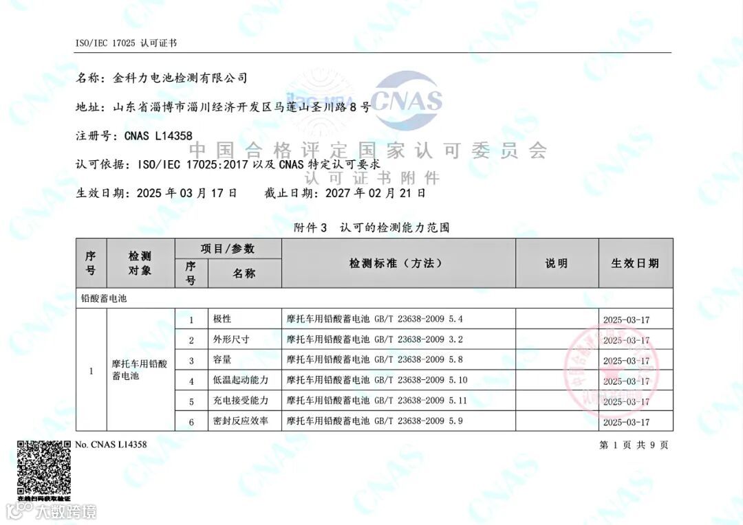 近日,金科力电池检测公司先后顺利通过CNAS复评审、扩项评审,以及CMA扩项评审,新增1份国家标准、2份浙江团体标准39项检测项目,可检测项目总数增至8份标准105项,检测范围进一步扩大,专业性和权威性再次得到国家权威机构的肯定。