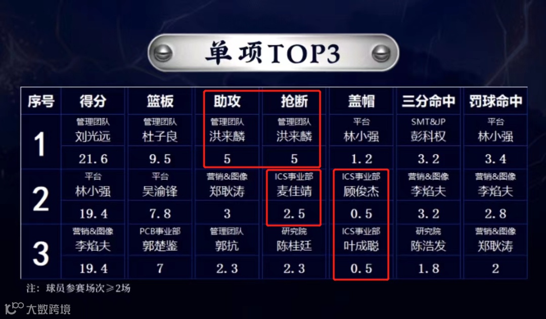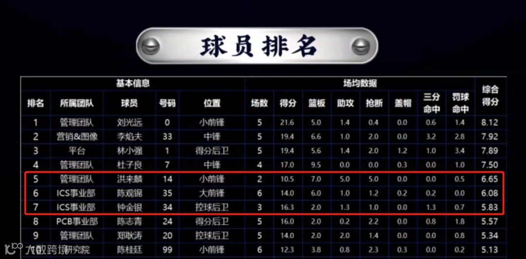 在个人积分排行榜中,ICS篮球队员洪来麟(总)、陈观锦和钟金银名列前茅,分别排名第五、第六和第七。