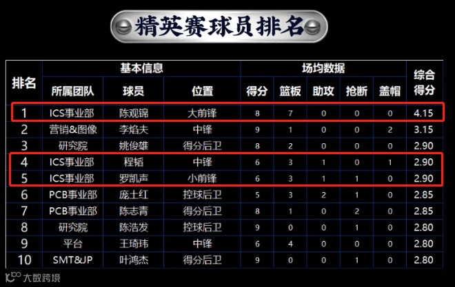 在精英赛中,ICS篮球队员陈观锦、程韬和罗凯声的综合得分靠前,分别排名第一、第四和第五。