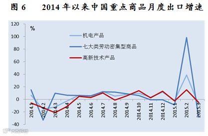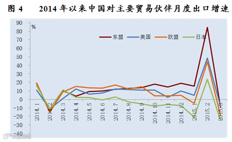 2015年一季度,中国对美国、欧盟出口分别增长11.3%和2.5%,对印度、东盟、南非出口分别增长23%、20.6%和20.1%,对日本、香港地区和俄罗斯出口分别下降11.8%、10.3%和34.5%。自南非、巴西、俄罗斯和澳大利亚进口分别下降48.3%、37.5%、32.6%和27.1%,合计拖累整体进口下降4.2个百分点。