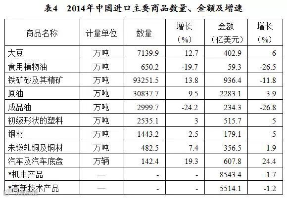 进口商品结构进一步优化。先进技术设备进口快速增长,生物技术产品、航空航天技术产品、计算机集成制造技术产品等高新技术产品进口增速均在15%以上,为国内产业结构调整提供了支撑。消费品进口1524亿美元,增长15.3%,占进口总额的7.8%,较2013年提高1个百分点,对满足多层次、多样化消费需求发挥了重要作用。