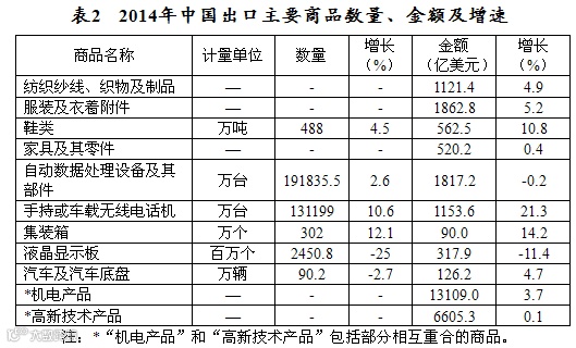 装备制造业成为出口的重要增长点。2014年,机电产品出口增长3.7%,占出口总额的比重达56%。装备制造业依靠突出的性价比优势开拓国际市场,电力、通讯、机车车辆等大型成套设备出口增长10%以上。纺织品、服装等七大类劳动密集型产品出口4851亿美元,增长5%。