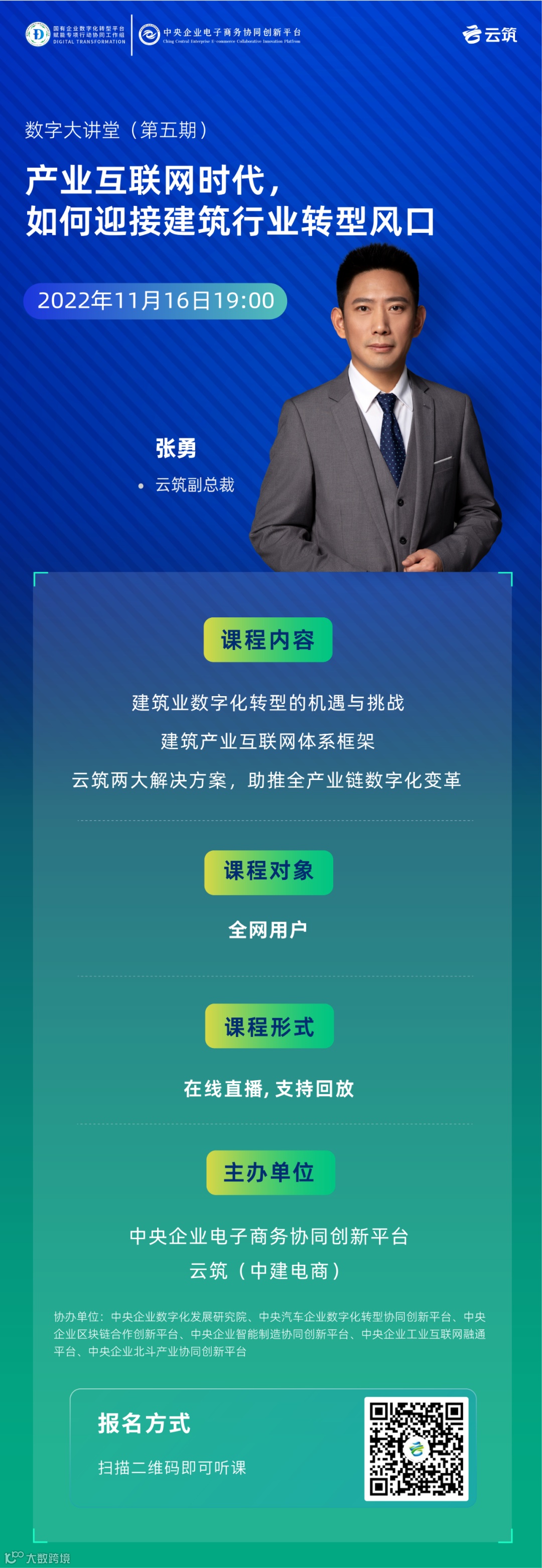 由中央企业电子商务协同创新平台、云筑(中建电商)共同主办的“产业互联网时代,如何迎接建筑行业转型风口?”直播活动将于2022年11月16日19点准时开始,届时直播间将不定时掉落神秘福利,欢迎大家预约参加。