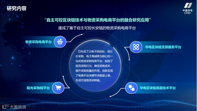 区块链在华电集团的应用(一期)科技项目以物资采购监管为切入点,建设内容包括华电区块链底层平台、华电区块链支撑服务平台和阳光采购链平台。华电区块链底层平台和华电区块链支撑服务平台作为集团的区块链基础设施,已具备支持集团内其他系统“+区块链”的需求,“阳光采购链”平台作为区块链在物资采购场景的落地试点应用,打造了具有流程可溯源、数据真实可信、业务高效协同和多方可信监管特点的采购监管平台。