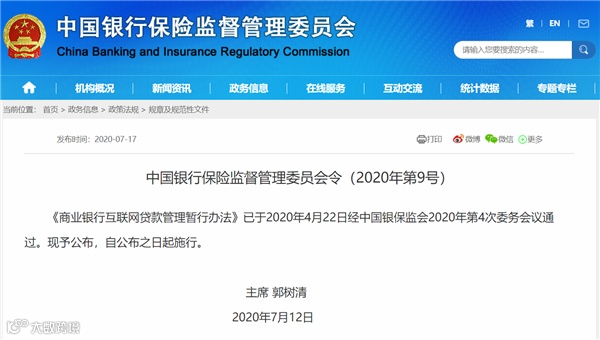 7月17日,中国银保监会发布《商业银行互联网贷款管理暂行办法》。据悉,《商业银行互联网贷款管理暂行办法》已于2020年4月22日经中国银保监会2020年第4次委务会议通过。现予公布,自公布之日起施行。