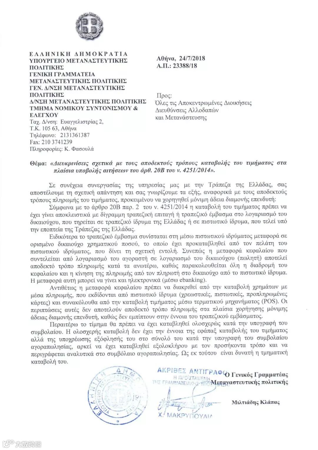 希腊移民局于2018年7月宣布投资人投资希腊房产时,不能用POS机刷卡的方式支付房款,只能通过银行转账的方式。
