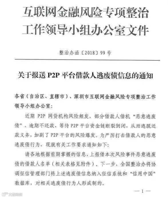 通知指出,为严厉打击P2P平台借款人的恶意废债行为,要求各地根据前期掌握的信息,上报借本次风险事件恶意逃废债的借款人名单。