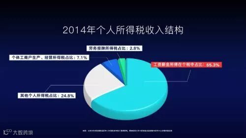 2014年,工资薪金所得在个税收入中的占比为65.3%,意味着超过六成的个税收入来自工薪所得,也就是说,其他10项个税的征收内容加起来,在个税收入中的占比都比不上工薪一项所贡献的个税。
