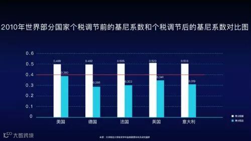 美国、德国、法国、英国等国家,它们的税前基尼系数都在0.4以上,而0.4是国际公认的警戒线,也就是说超过这个数字,社会不稳定的可能性会增大。但经过个税的调节作用后,这些国家的基尼系数大幅下降0.2左右,回到了警戒线以下。