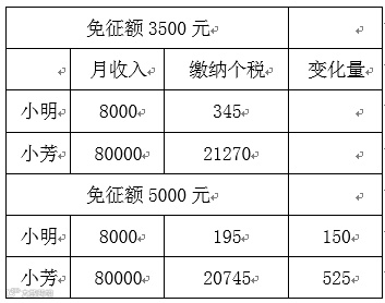 举个例子,工薪阶层小明月入8000元,高收入者小芳月入80000元,这里说的都是扣除五险一金后的应税收入,在现行的免征额下,小明每月需要缴纳个税345元,小芳需要缴纳个税21270元。
