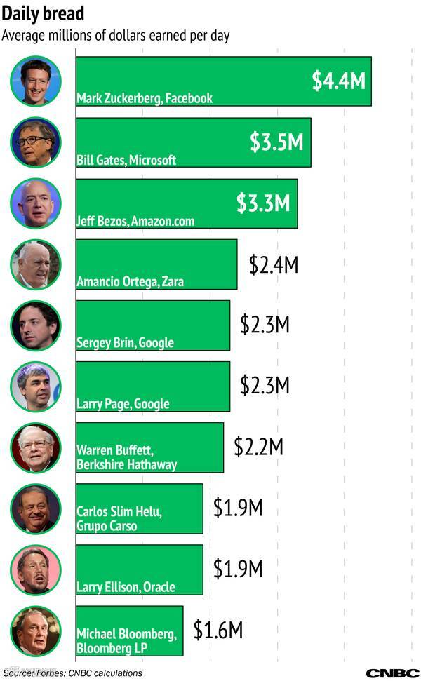 这项统计的标准是用这些超级亿万富翁的财富总额除以他们各自的年龄(按天计算),得出这位富豪平均每日赚钱的能力。这份榜单排名前十的都是一些我们耳熟能详的家伙,比尔·盖茨、杰夫·贝佐斯、谢尔盖·布林、拉里·佩奇……