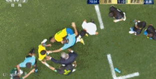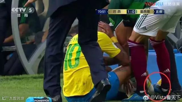 在巴西与墨西哥战至第71分钟时,内马尔对抗后摔出边线,双腿夹球坐在地上。墨西哥球员拉云心急火燎地要从内马尔双腿之间抱走皮球,拉云在抱球的同时,右脚前脚掌也踩到了内马尔的右脚踝上。