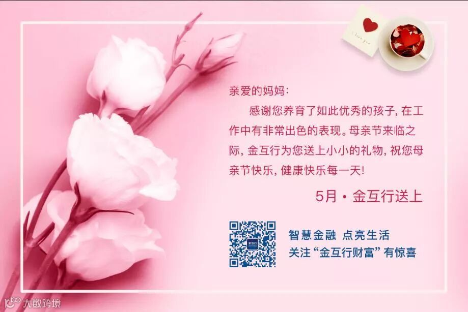 为了庆祝这个美好的日子,为增强企业凝聚力,提高员工的幸福感,感谢小伙伴的辛勤工作,感谢妈妈培养了如此优秀的你,值此母亲节到来之际,金互行特为各位金互行人的妈妈准备了一份母亲节礼物,愿大家的妈妈都永远健康美丽,每一天美美哒~