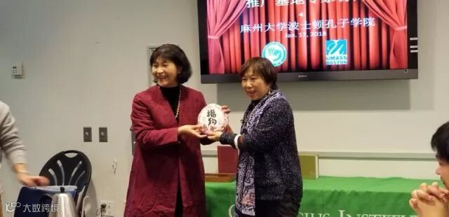 副校长对在寒冷的大雪天,来自中国的茶人们所带来的温暖表示热烈欢迎。王旭烽教授向麻州大学、学院孔子学院及孔子学院院长分别赠送了《茶人三部曲》、纪录片《茶,一片树叶的故事》、快乐普洱、茶服等茶礼。
