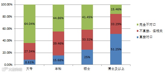 但数据显示,56.7%的应届生表示就业岗位与所学专业完全不对口,只有1/4的应届生就业岗位与所学专业直接对口,其他应届生表示就业岗位与所学专业相关,但不直接对口。