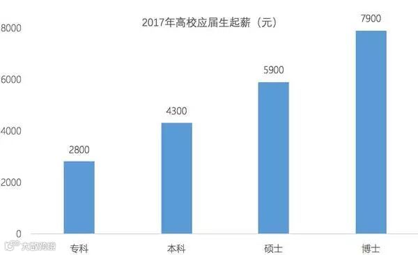 报告显示,2017年专科应届生起薪2800元,本科应届生起薪4300元,硕士研究生起薪5900元,博士研究生起薪7900元。