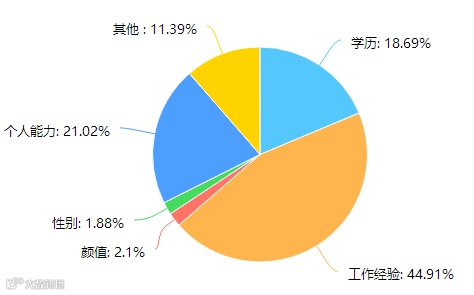 2017年应届生在就业难度感知方面,表示“有点难,但可以接受”的比例占到49.3%,认为“很难,要费很大功夫”的比例占到32.4%,表示“很轻松”、“不难”的比例合计占到12.8%。而在影响应届生签约的因素中,工作经验以44.9%排在首位,紧随其后的是个人能力和学历,同时与实践能力直接挂钩的工作经验也被用人单位作为选择人才的首要因素。