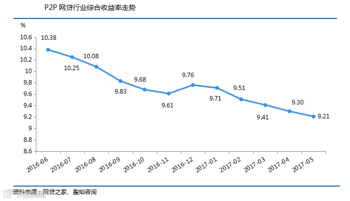 来自网贷之家的最新统计数据显示,2017年5月,P2P网贷行业综合收益率为9.21%,环比下降了9个基点(1个基点=0.01%),同比下降了175个基点。其中,主流综合收益率区间仍分布在8%-12%,平台占比为56.82%;其次为综合收益率在12%-18%的平台,占比为28.14%,8%以下低息平台占比为12.06%,24%及以上的高息平台占比较上月小幅上升,为0.23%。