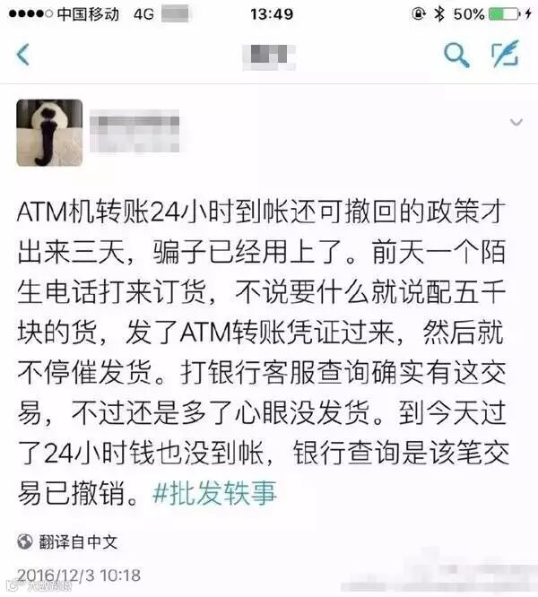 另有网友爆料称,前天一个陌生电话打来订货,不说要什么就说配5000块的货,发了ATM转账凭证过来,然后就不停催发货,打银行客服查询确实有这交易,不过还是多了心眼没发货,到今天了24小时钱也没到账,银行查询是该笔交易已撤销。