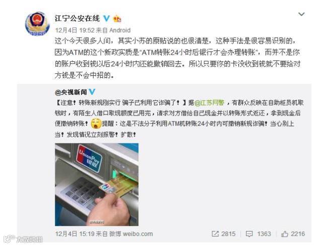 警方提醒,根据银行新规,在ATM机上转账时,除同行同户名的卡,其他均在24小时后才能到账,且24小时内可撤销转账!不法分子以“先转账、再取现”骗取受害者信任,在拿到现金后,便会前往柜台撤销转账。广大网友及银行工作人员如发现类似情况,请立即拨打110报警!