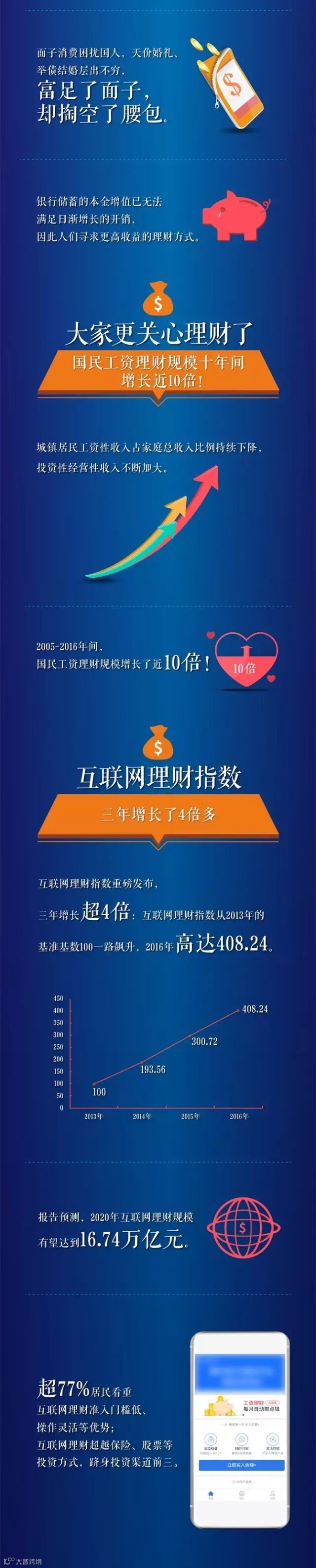 2013-2016年间,我国互联网理财指数增长超四倍,互联网理财规模由3853亿元激增到2.6万亿元,预计到2020年将达到16.74万亿元。