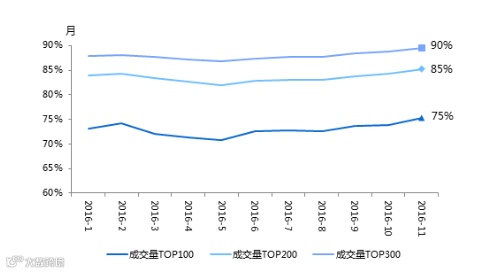 截至2016年11月末,P2P网贷行业成交量前100的平台成交量占到全行业成交量的75%;前200的平台成交量占比为85%;前300的平台成交量占比高达90%,如图3所示。从今年P2P网贷行业集中度数据及走势来看,反映出P2P网贷行业离寡头垄断距离尚远,但行业集中度提升,马太效应加剧。