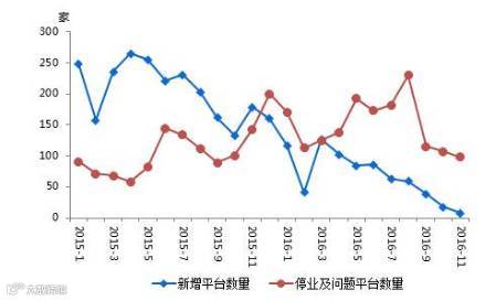 此外,2016年截至11月末,停业及问题平台中,跑路有389家,提现困难有150家,经侦介入有5家,停业达1075家,转型有26家。今年影响较大的问题平台事件主要是e速贷、国诚金融、京金联等。预计未来一年,良性退出(包括停业及转型)将是平台主要退出方式,早期野蛮发展导致的问题平台数量持续减少,良币将逐步驱逐劣币。