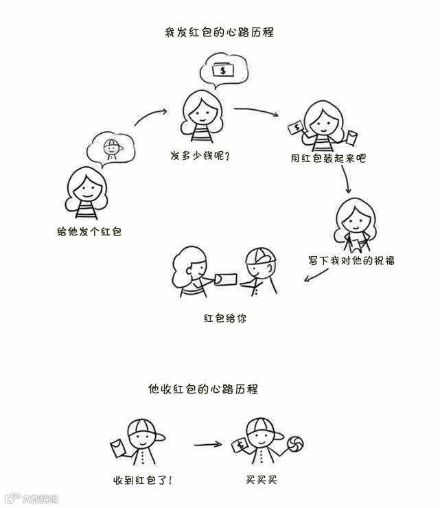 红包无非两个流程,一个收、一个发,要快、要直接。回想你收到亲朋好友压岁钱红包那会儿的你和TA是啥心情?事实上,在现实生活中,当人们发红包或者收红包时,行为和结果的心智模型已经形成。设计上要做的就是跟随这种心智模型去摸索交互原型,这能帮助用户更容易的认知、使用红包。