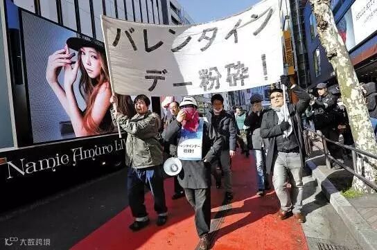 在日本,为了对抗这个充满商业味道的节日,单身青年们组成“战队”,高喊着“情侣去死”的口号,朝街头的情侣们投去“标枪”一般蔑视目光。