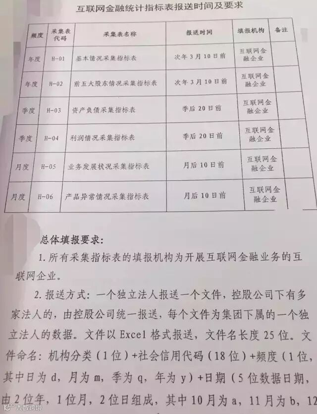 在网上流传的《互联网金融统计制度》中,规定了互联网金融统计指标报送的时间及要求,包括公司基本信息、财务信息、业务信息三类共六张统计表,分别按照年度、季度和月度进行数据统计。
