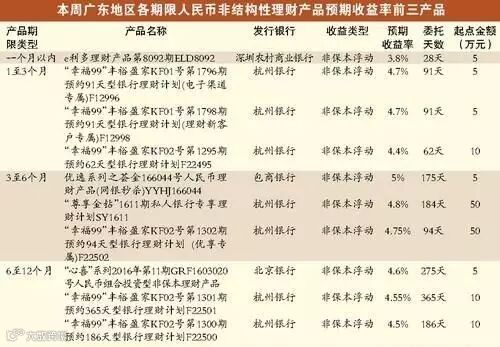 据统计,上周广东地区发行的人民币非结构性银行理财产品平均预期收益率小幅下跌,仅为3.91%。