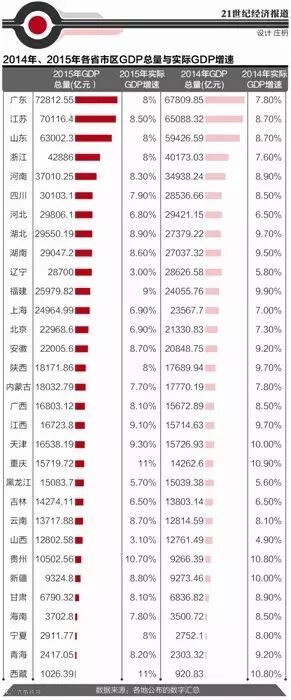 2015年,全国经济增速为6.9%。2015年,广东经济增速为8%,高于2014年的7.8%。浙江2015年经济增速为8%,也高于2014年7.6%的增速。西藏和重庆2015年经济增速均为11%,排名全国第一,均比2014年的10.9%、10.8%加快。受此影响,重庆2015年经济总量超过了黑龙江。陕西、贵州、江西也分别超过内蒙古、新疆、天津的经济总量。广西也超过了天津和江西的经济总量。