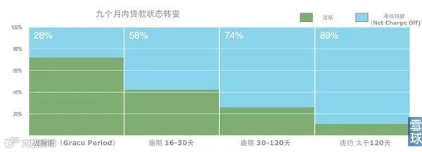 A级贷款表示不想与其他级别说话,并向它们扔了一个鄙夷的眼神。虽然A级差强人意,但其他几位表现着实堪忧,坏账率远高于传统银行,比如花旗银行的数字大约为2%,信用卡公司Discover Financials大概是2%出头一些。LendingClub的审核机制或许技术上颇为靠谱,但由于之前提到那个类似于逆向选择的问题——上门的都是被银行谢客的杨白劳——坏账率不甚理想。LengingClub通过其内部核算,统计出当一笔贷款进入逾期状态后,各个时间段内最终被核销的贷款比率。下图代表2015年1月至3月的平均 “九个月内贷款回收”的状态。净核销额 (Net Charge Off)等于总核销额减去在此九个月结束后三个月内收回的资金。所以左上角的28%,是指2015年1月至3月的所有进入宽限期 (Grace Period)的贷款中,最后有28%的贷款不幸被净核销。