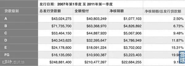 那么有了这套自动化程度极高的贷款审核系统,咱贷款的小船能不能就不翻?当然贷款违约就像第一型糖尿病,只能控制,无法治愈。LendingClub官方并未给出总体违约率的准确数字,一些研究机构给出的数字是大约为5%至7%。我们也可以在LendingClub发布的信息中找到其各个级别贷款的具体表现(见下图),好在LendingClub的运营历史够长,2011年第一季度之前的贷款已经基本都到期,我们可以大概计算出各个级别贷款以及总贷款额的坏账净核销率(见下表)。