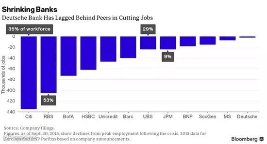 以下图表可见,截至2015年9月30日,各大行金融危机以来的裁员人数。其中裁员比例最大的是苏格兰皇家银行,裁撤人数占员工总数的53%。