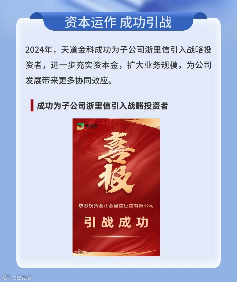天道金科股份有限公司是由浙江金控发起成立的国有控股企业。作为数字经济新业态、新模式的典型平台,公司致力于将产业数字化平台与应用场景深度融合,开发数据资源要素在促进产业变革中的价值,推动数字技术和实体经济融合共生,助力数字经济高质量发展。