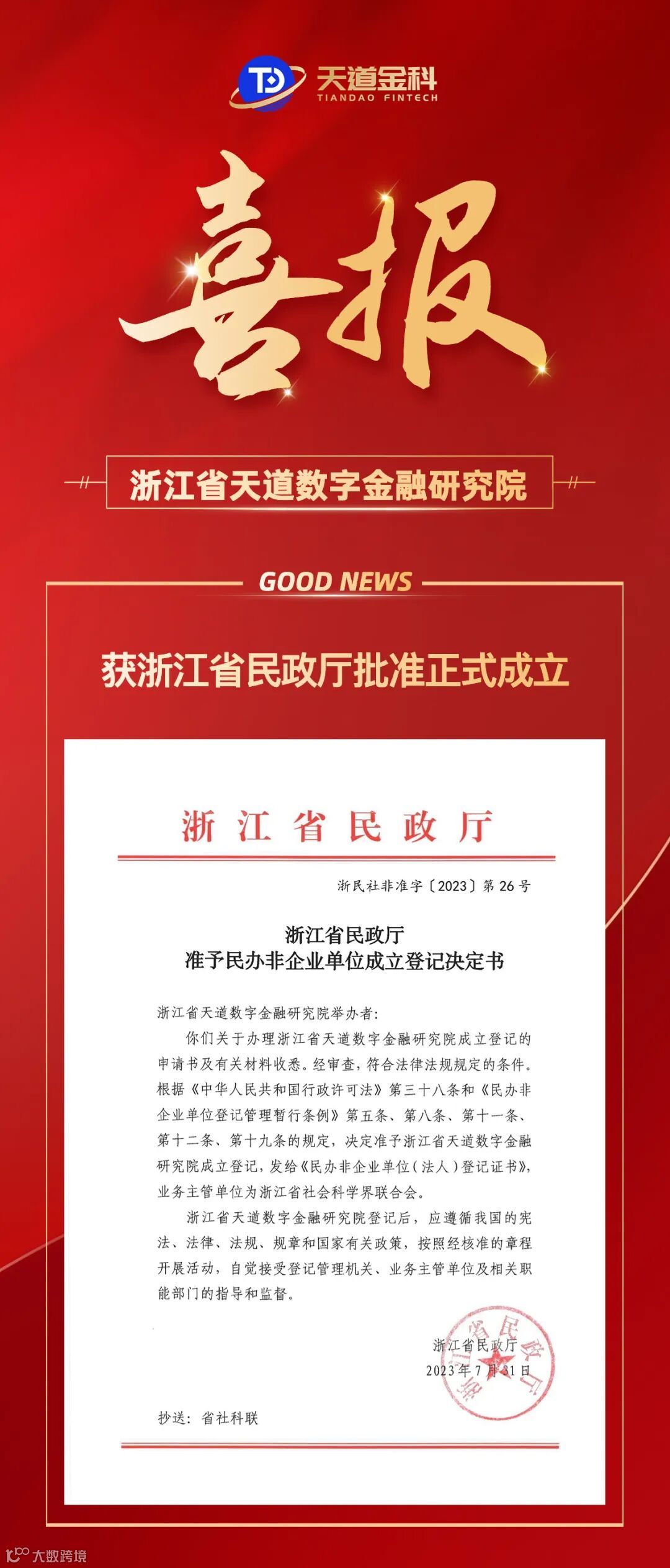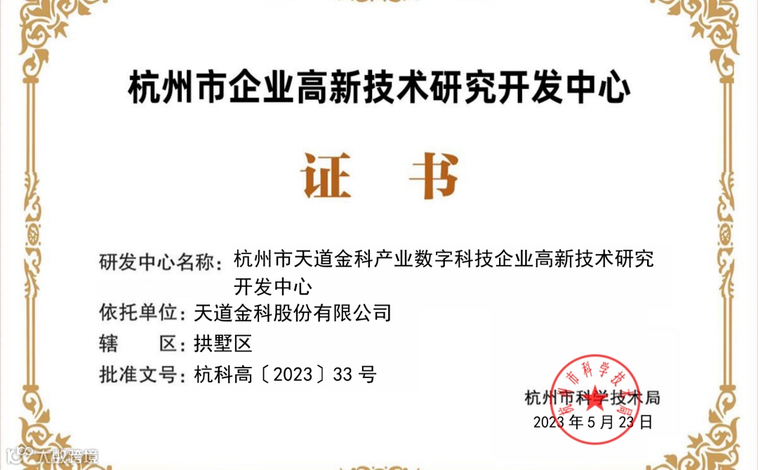 近日,由天道金科发起设立的省级研究机构——浙江省天道数字金融研究院获浙江省民政厅批准正式成立并颁发民办非企业单位登记证书,标志着公司在数字金融领域探索进程取得了里程碑式突破。
