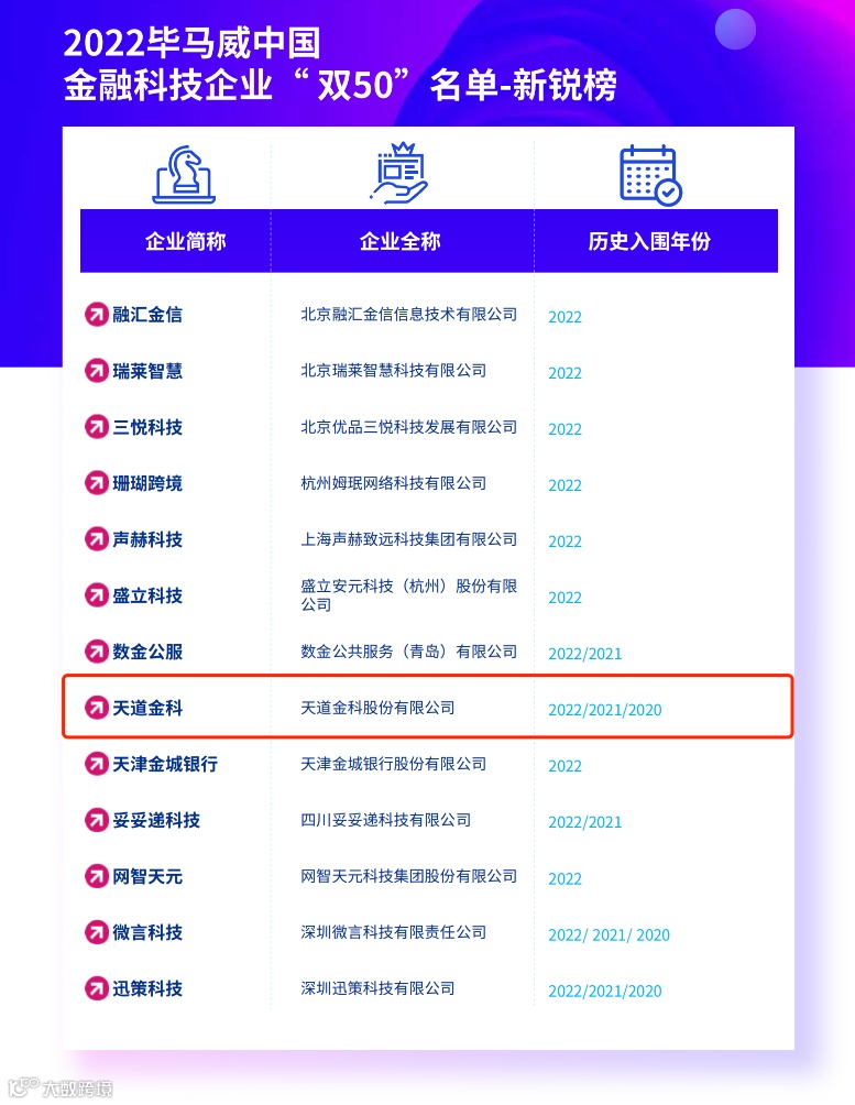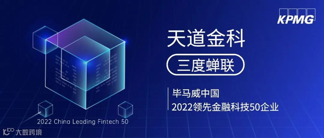 2023年1月16日,“2022毕马威中国金融科技企业‘双50’榜单发布暨颁奖典礼”在北京、上海、深圳三地线上线下同步举办。天道金科凭借自身卓越的技术与产品创新应用能力,在大数据与AI赛道成功入选。这是天道金科继2020、2021年入选后,连续第三次获此殊荣。此外,天道子公司浙江浙里信征信有限公司也二度入选本年度榜单,喜上加喜!
