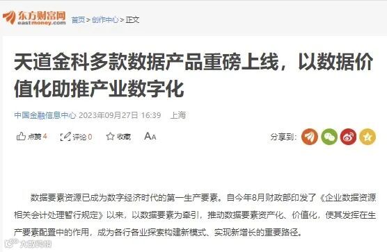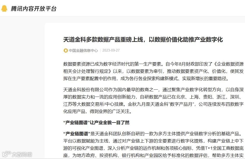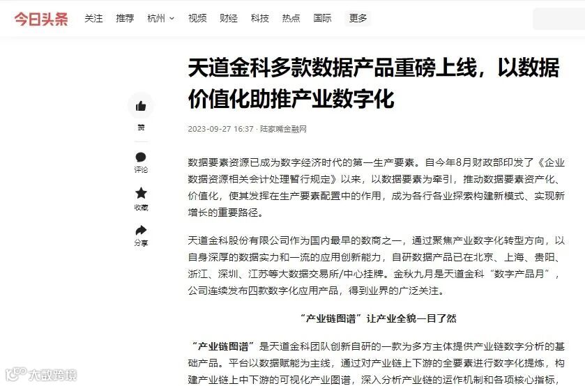 天道金科股份有限公司作为国内最早的数商之一,通过聚焦产业数字化转型方向,以自身深厚的数据实力和一流的应用创新能力,自研数据产品已在北京、上海、贵阳、浙江、深圳、江苏等大数据交易所/中心挂牌。金秋九月是天道金科“数字产品月”,公司连续发布四款数字化应用产品,得到业界的广泛关注。